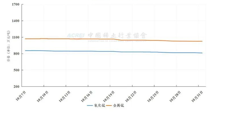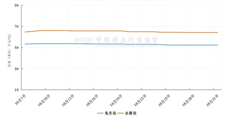 In October, the average price of praseodymium neodymium oxide was 522200 yuan/ton, a decrease of 0.1% month on month; The average price of metal praseodymium neodymium was 643000 yuan/ton, an increase of 0.7% month on month.