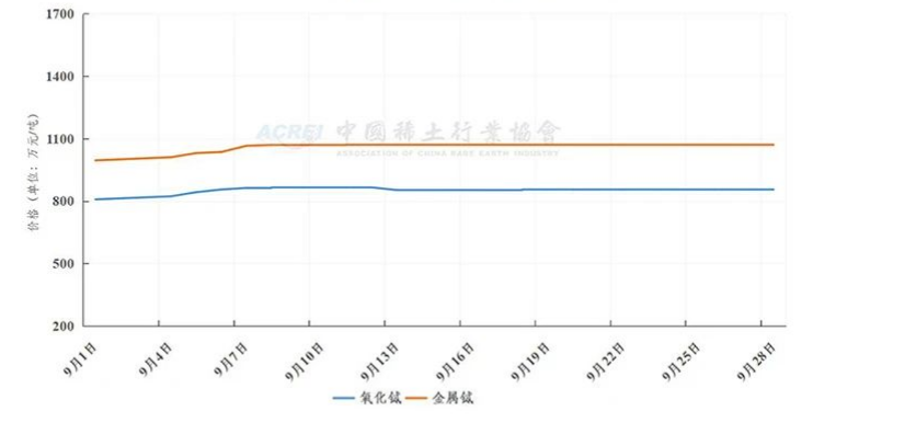 In September, the price of 99.99% terbium oxide was 8.518 million yuan/ton, an increase of 13.9% month on month; The price of metal terbium was 10.592 million yuan/ton, an increase of 11.9% month on month.