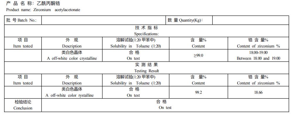 Zirconium acetylacetonate can be used as additive including halogenated polymers, used in the dispensing of polyvinyl chloride (PVC) heat stabilizers, used as catalyst, and also can be used as a crosslinking agent of resin, resin hardening accelerator, etc.